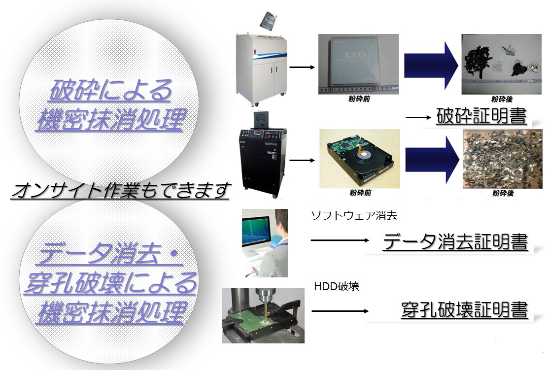 ソフト消去・穿孔破壊・破砕による情報抹消、機密書類の処分、各種証明書発行